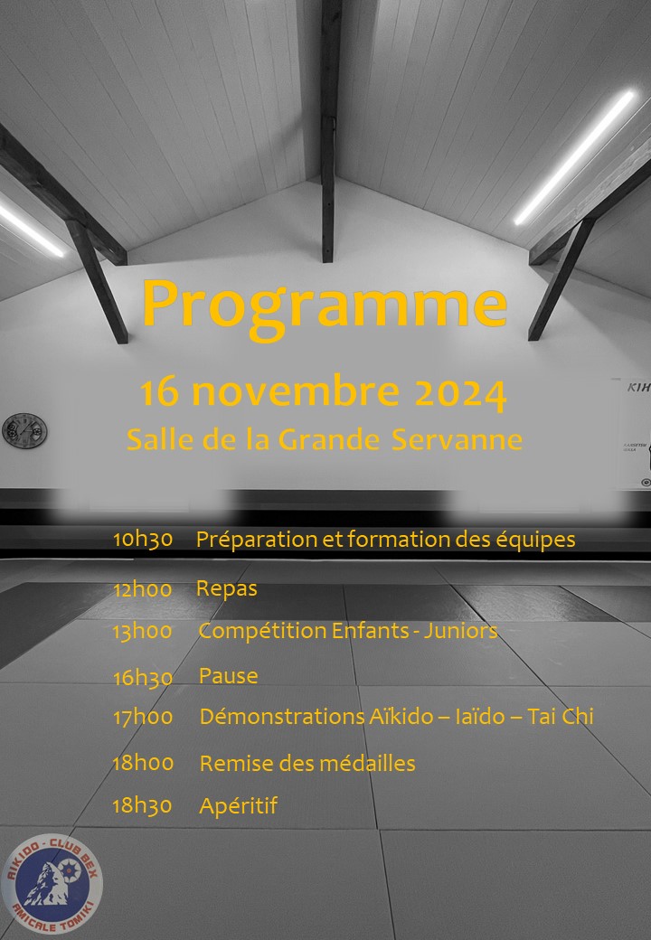 Au programme, compétition d’Aïkido pour les enfants et juniors, démonstrations d’Aïkido, d’Iaïdo et de Tai Chi, suivi d’un apéritif
